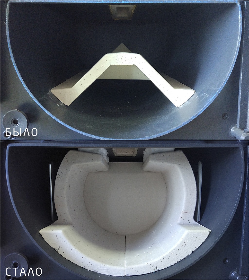 - Нижняя камера дожига пиролизного газа, вместо фасонной керамической детали "крыша", получила полную футеровку армированной керамикой.