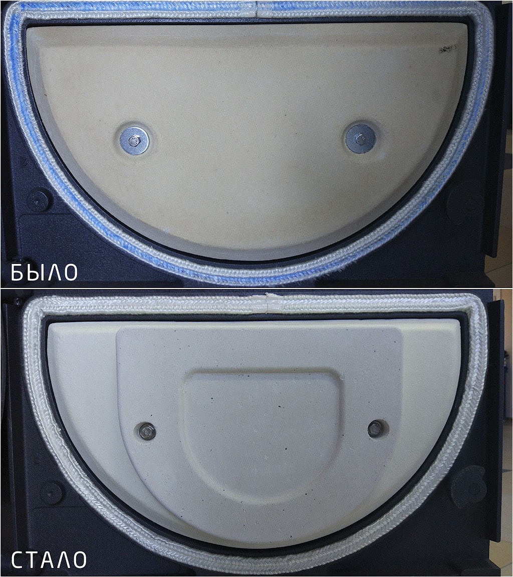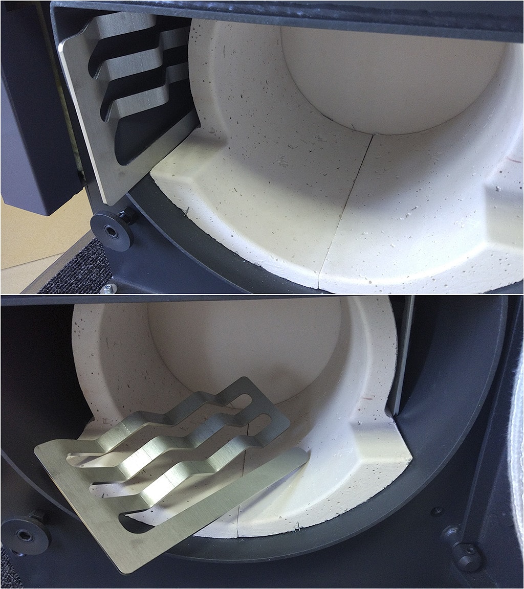 - Дверца нижней камеры, вместе с традиционной жаростойкой изоляцией Sibral, теперь дополнительно оснащена керамической деталью "полумесяц", которая, при закрытой нижней дверце, делает камеру дожига керамической со всех сторон.