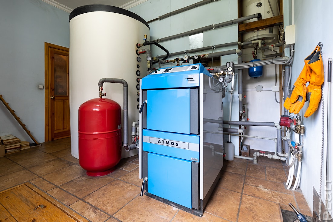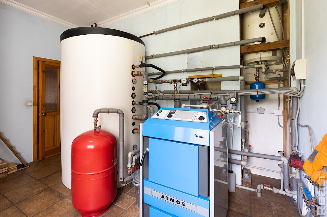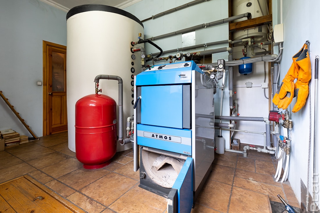 На первый взгляд, система отопления кажется сложной и дорогой. Котел нагревает воду, которая накапливается в специальной емкости объемом 1500 литров. Далее она циркулирует в теплый пол на первом этаже и радиаторы на втором этаже, а также нагревает бойлер.