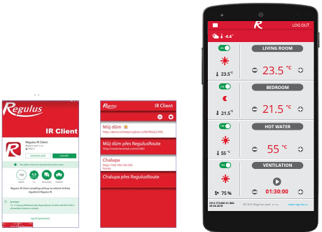 Все параметры отопления и вентиляции помещения и ГВС могут контролироваться и управляться на сайте в личном кабинете пользователя. Доступ к веб-сайту контроллера можно получить через Интернет с помощью услуги RegulusRoute, или через прямой доступ к контроллеру с публичным IP-адресом, или из локальной сети даже без Интернета. Благодаря специальному приложению для IR-клиентов, управление легко осуществляется также с мобильных телефонов и планшетов.