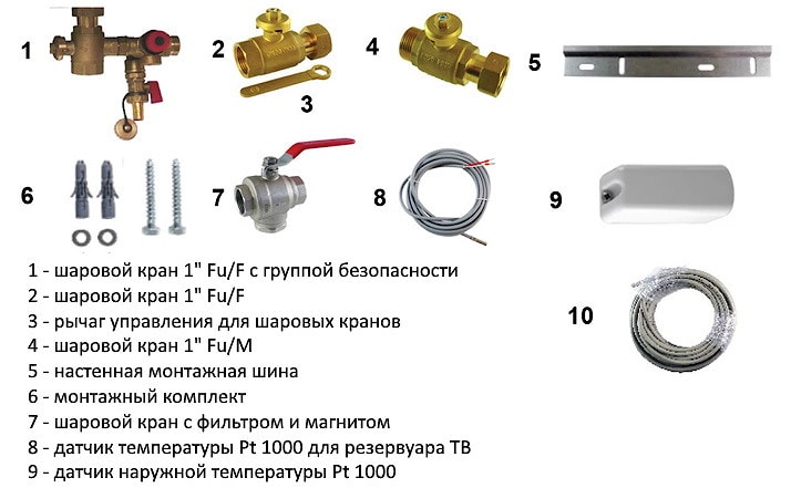 - шаровой кран 1" Fu/F с группой безопасности для подключения расширительного бака - предохранительный и сливной клапан;
