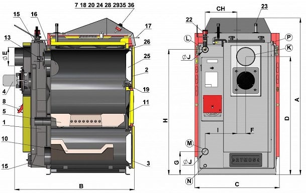 | 16. | Заслонка | 36. | Предохранительный термостат |