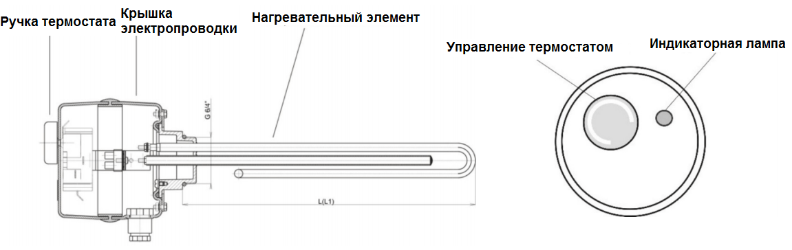 Нагревательный блок состоит из электрического нагревательного элемента с соединительной резьбой G 6/4" (Рисунок 2). Под кожухом электрооборудования размещен рабочий термостат, защитный термостат, индикатор работы водонагревателя и подключающая клеммная плата.