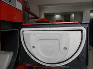 На дверце нижней камеры установлена (в нашем случае) пеллетная горелка. Нижняя камера сгорания также выложена вставками из армированной керамики, дверца защищена жаростойким материалом Sibral.