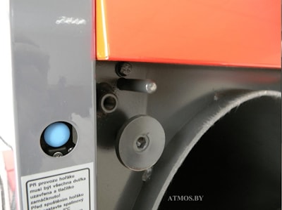 Для максимально безопасной работы котла существует двойная защита от открывания дверец: чтобы котел запустился, необходимо закрыть дверцу, которая нажимает на концевой выключатель (на фото – верхняя деталь) и нажать на кнопку (слева, синяя). Только после этого котел начнет работу. Если на запущенном котле открыть дверцу, работа котла прекратится.