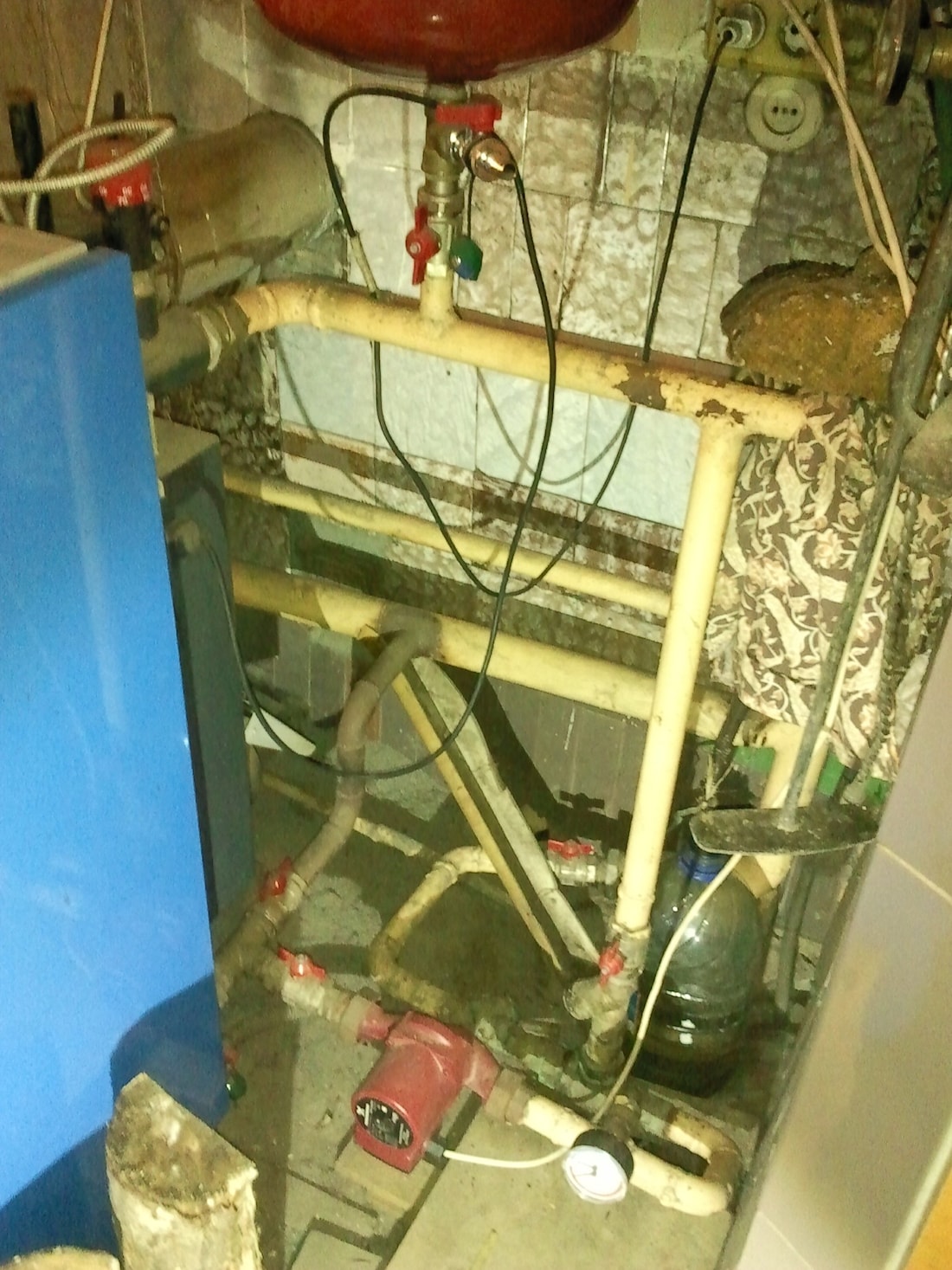 Котел был куплен 18.08.2009. Монтаж в стесненных условиях малого пространства делали Игорь Куропатенко и Олег Шабан. Изначально не планировалось наличие каких-либо аккумуляторов тепла из-за нехватки места.