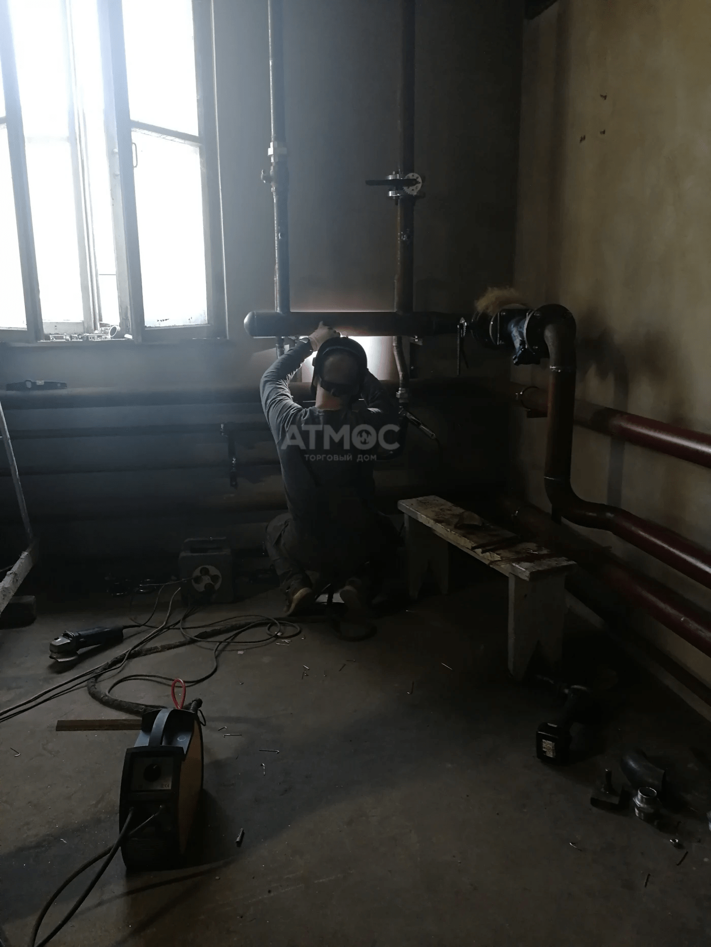 Для надежной работы всей системы отопления обвязываем твердотопливные котлы при помощи сварки стальных труб.
