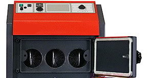 Управление горелкой: посредством электронной системы регулировки, управляющей работой шнекового транспортера, двух спиралей для розжига и вентилятора горелки. Электроника защищена предохранительным термостатом котла, защитным термостатом на устройстве подачи пеллет в горелку, датчиком отборотов вентилятора. Работа горелки отображается на дисплее электронной регулировки.