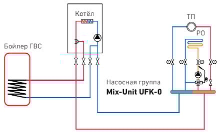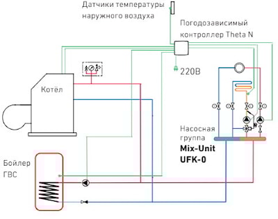 На изображении представлено индивидуальное решение на 1 смесительный и 2 прямых контура на основе компактного модуля MIX-Unit (насосы не входят в стандартную комплектацию группы).