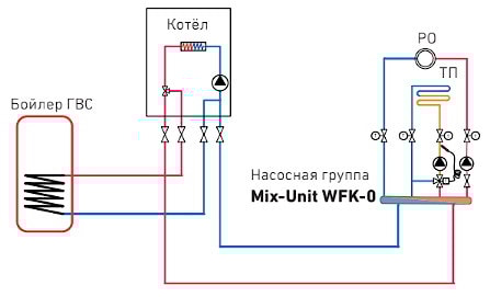 На изображении представлено индивидуальное решение на 1 смесительный и 2 прямых контура на основе компактного модуля MIX-Unit (насосы не входят в стандартную комплектацию группы).