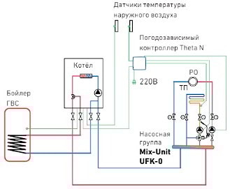 1 смесительный (термоголовка), 1 прямой контур, гидростелка