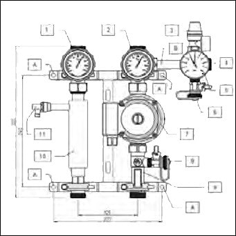 - 2 шаровых крана с термометрами и встроенными обратными клапанами; группа безопасности с манометром 0-10 бар, клапаном избыточного давления 6 бар и сливным краном SFE;
