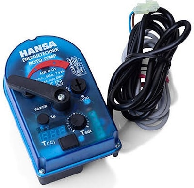 Электронный сервопривод для автономного управления и поддержания постоянной температуры подающей линии. Привод предназначен для монтажа на трёхходовые смесительные вентили HANSA DN 25/32/40, которые входят в комплект группы МК. Приводной механизм имеет зафиксированный угол поворота 90°, оснащен переключателями для выбора диапазонов регулирования температуры и направления вращения.