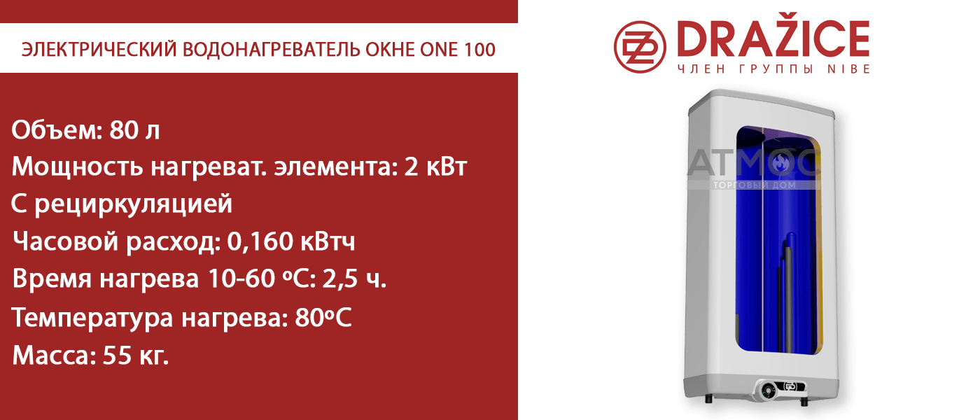 ООО "Торговый дом "АТМОС" - официальный представитель чешского производителя водонагревателей DRAZICE в Беларуси.Позвоните нам +375 29 374 13 45 или оставьте запрос, чтобы купить электрический бойлер DRAZICE OKHE ONE 100 со скидкой и получить дополнительные бонусы.