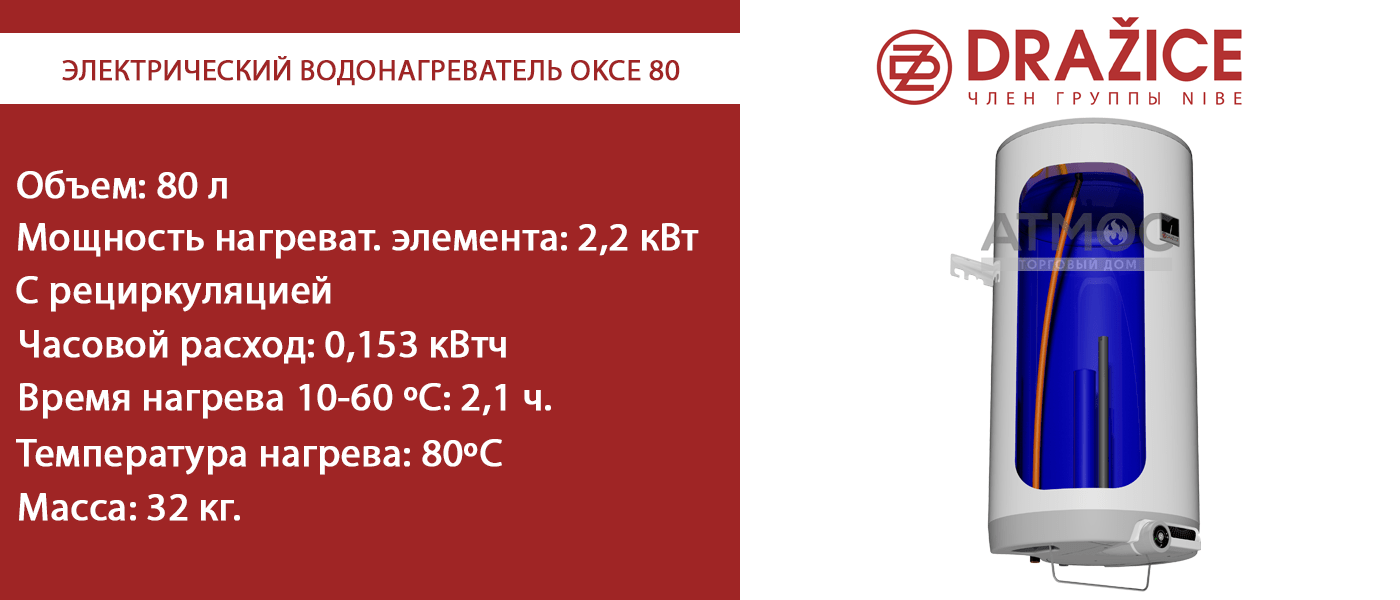 ООО "Торговый дом "АТМОС" - официальный представитель чешского производителя водонагревателей DRAZICE в Беларуси.Позвоните нам +375 29 374 13 45 или оставьте запрос, чтобы купить электрический бойлер DRAZICE OKСE 80 со скидкой и получить дополнительные бонусы.