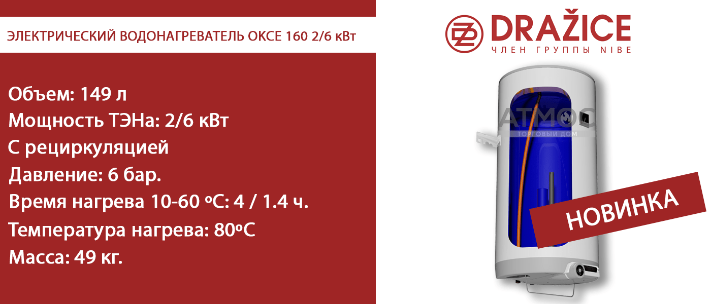 ООО "Торговый дом "АТМОС" - официальный представитель чешского производителя водонагревателей DRAZICE в Беларуси.Позвоните нам +375 29 374 13 45 или оставьте запрос, чтобы купить электрический бойлер DRAZICE OKCE 160 2/6 кВт со скидкой и получить дополнительные бонусы.