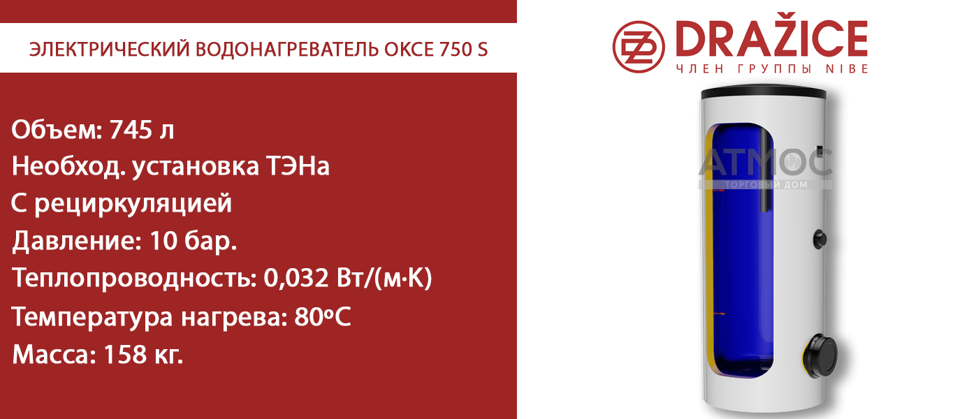 ООО "Торговый дом "АТМОС" - официальный представитель чешского производителя водонагревателей DRAZICE в Беларуси.Позвоните нам +375 29 374 13 45 или оставьте запрос, чтобы купить электрический бойлер DRAZICE OKCE 750 S со скидкой и получить дополнительные бонусы.