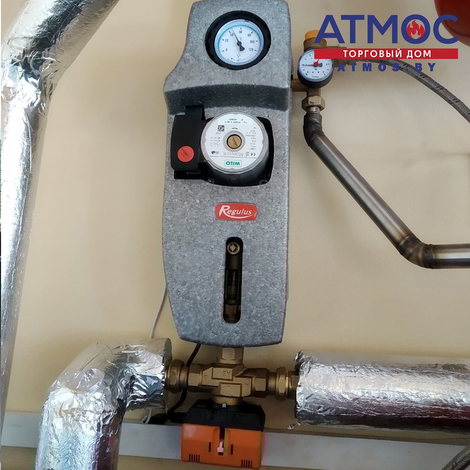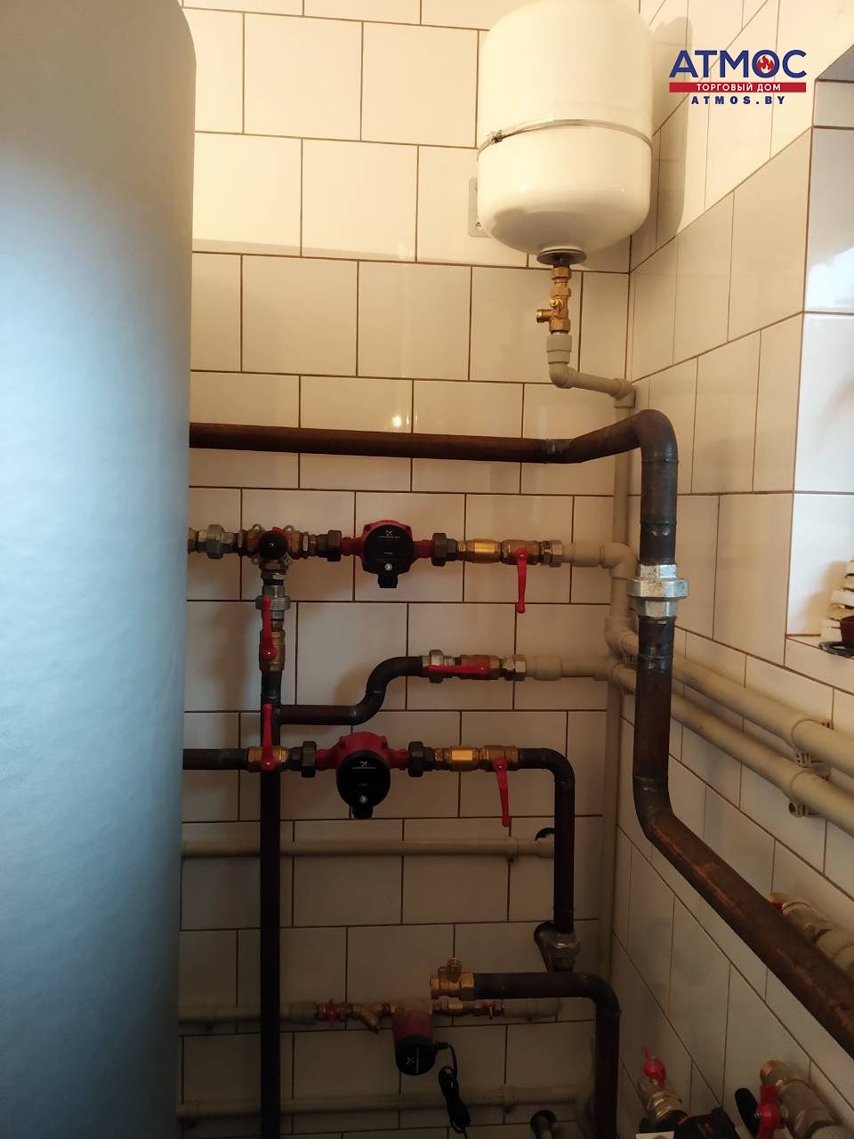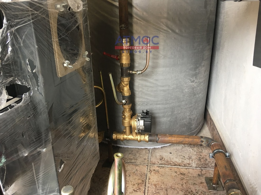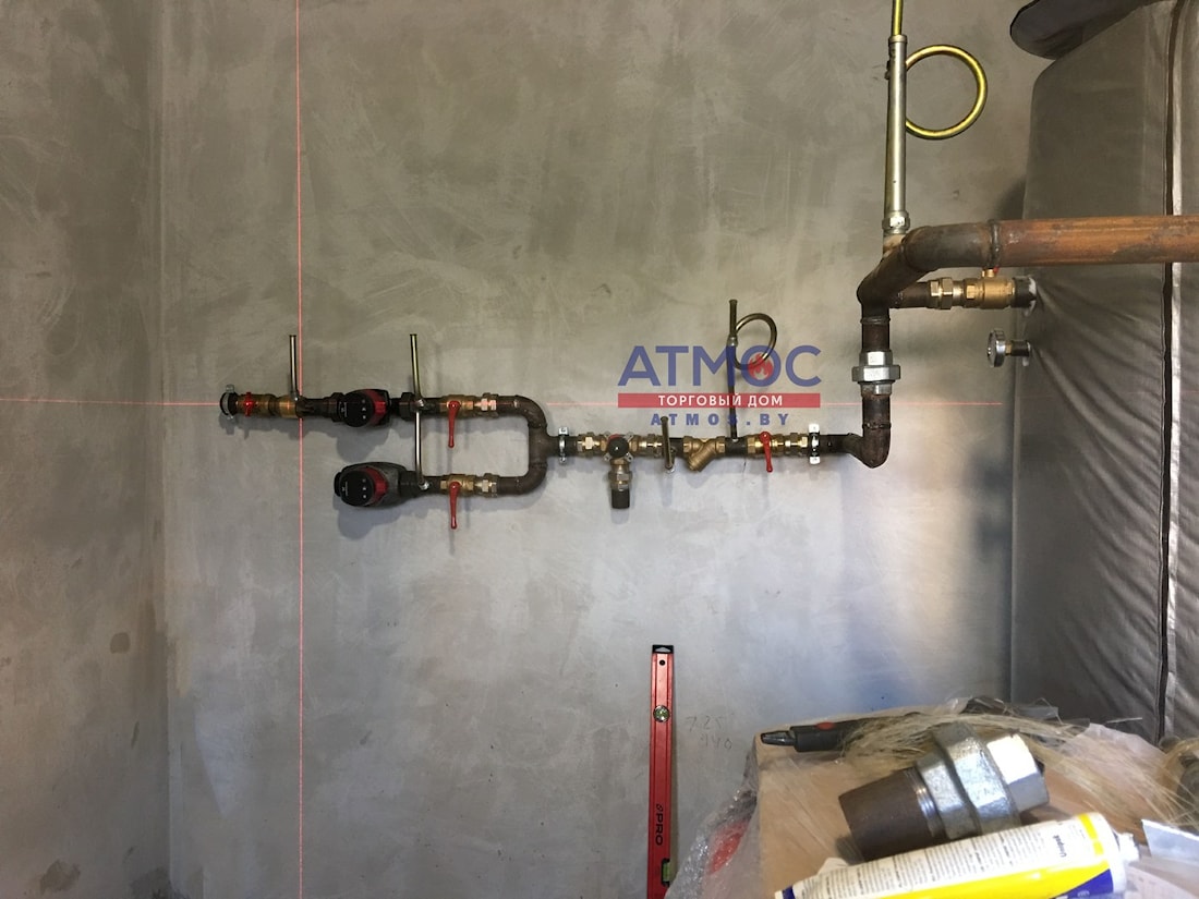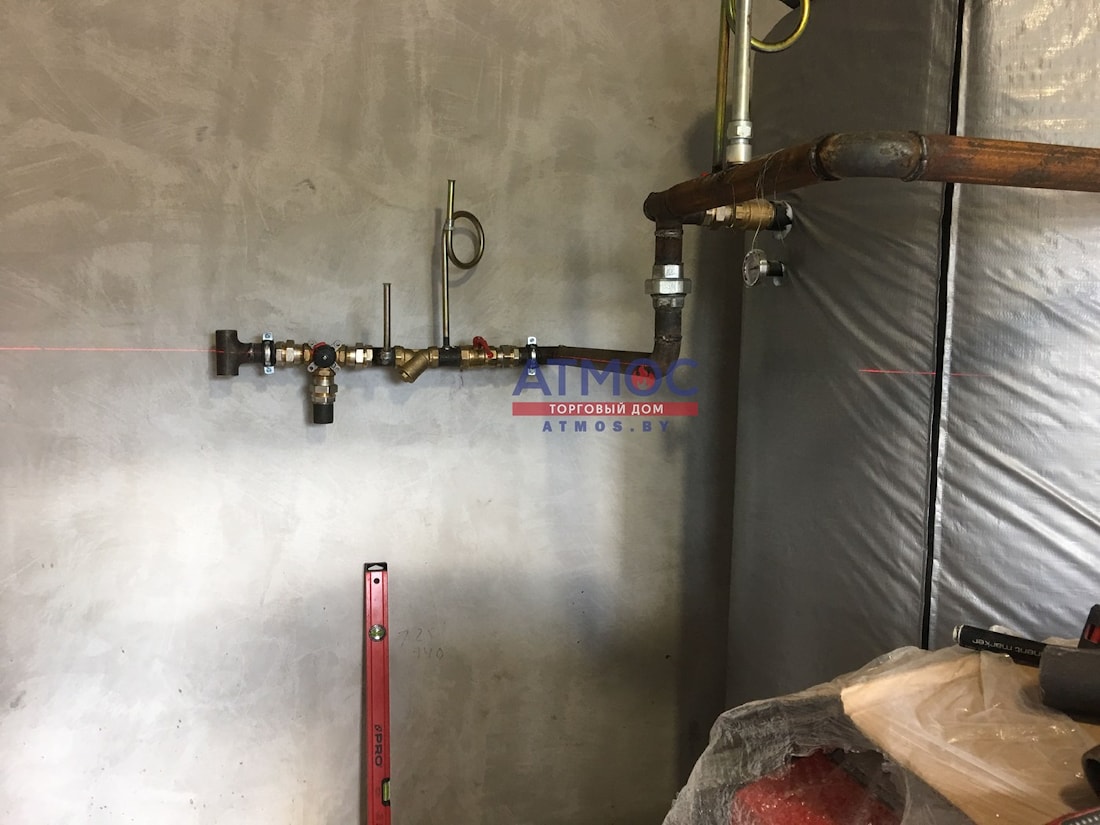 Монтажные работы по установке твердотопливного пиролизного котла ATMOS DC40SX с наружным утепленным дымоходом. Обвязка газогенераторного котла ATMOS DC40SX в административно-складском комплексе в г.Полоцке Витебской области выполнена стальной трубой с применением электрогазосварочных работ. Для энергоэффективного отопления предусмотрена установка аккумулирующей емкости на 1000л и разделение контуров для индивидуального отопления офисных помещений и складских. Для обвязки малого контура котла использована насосная группа REGULUS THERMOMAT LK810. Основные узлы - группа безопасности, трехходовый смесительный вентиль, вентиль против перегрева котла BVTS - чешского производителя REGULUS.