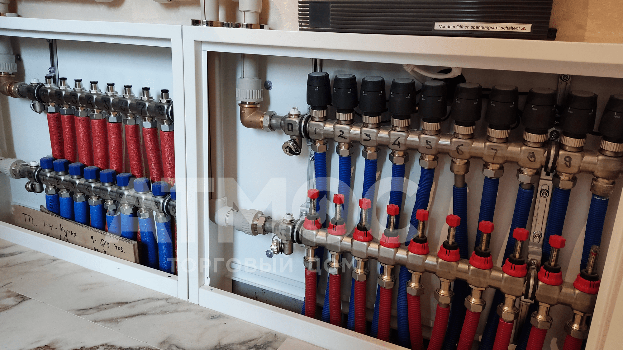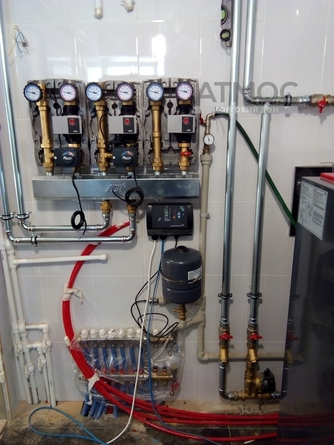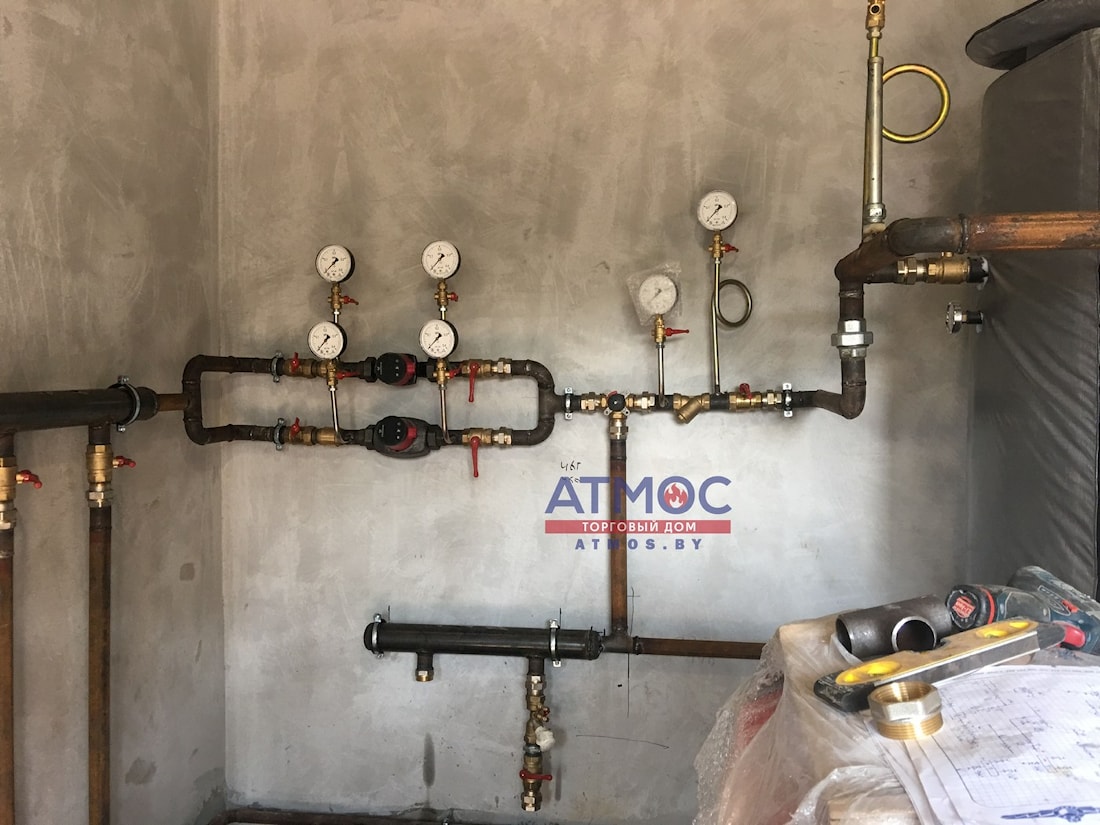 Был произведен полный монтаж системы напольного и радиаторного отопления. В дальнейшем на объекте будет устанавливаться погодозависимая автоматика TECH с управлением температуры по этажам.