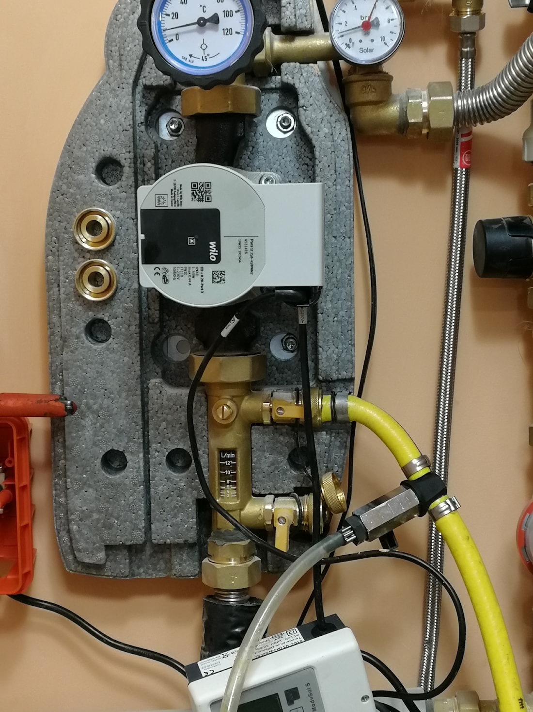 В топочной установлены универсальный газогенераторный котел ATMOS DC25S с пеллетной горелкой Atmos A25, аккумулирующие емкости Drazice и водонагреватель Drazice. Для малого контура котла применена насосная группа Thermovar чешского производителя Regulus. Для подогрева воды установлены чешские солнечные коллеторы с U-образными трубками фирмы REGULUS. Управление и контроль системой отопления осуществляет погодозависимая автоматика ATMOS ACD01. Обвязка котла произведена стальной трубой с применением сварочных работ.