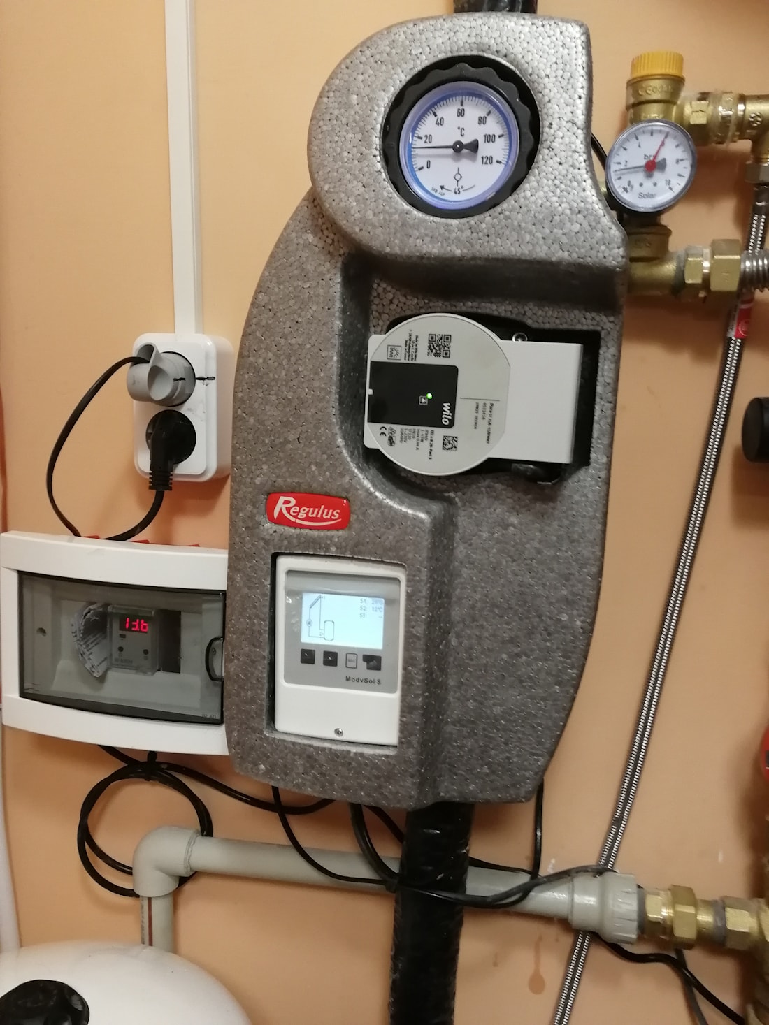 Установлено 4 плоских солнечных коллектора REGULUS KPS1 суммарной мощностью 5,924 кВт и бивалентный бойлер косвенного нагрева DRAZICE OKC 300 NTRR/BP.