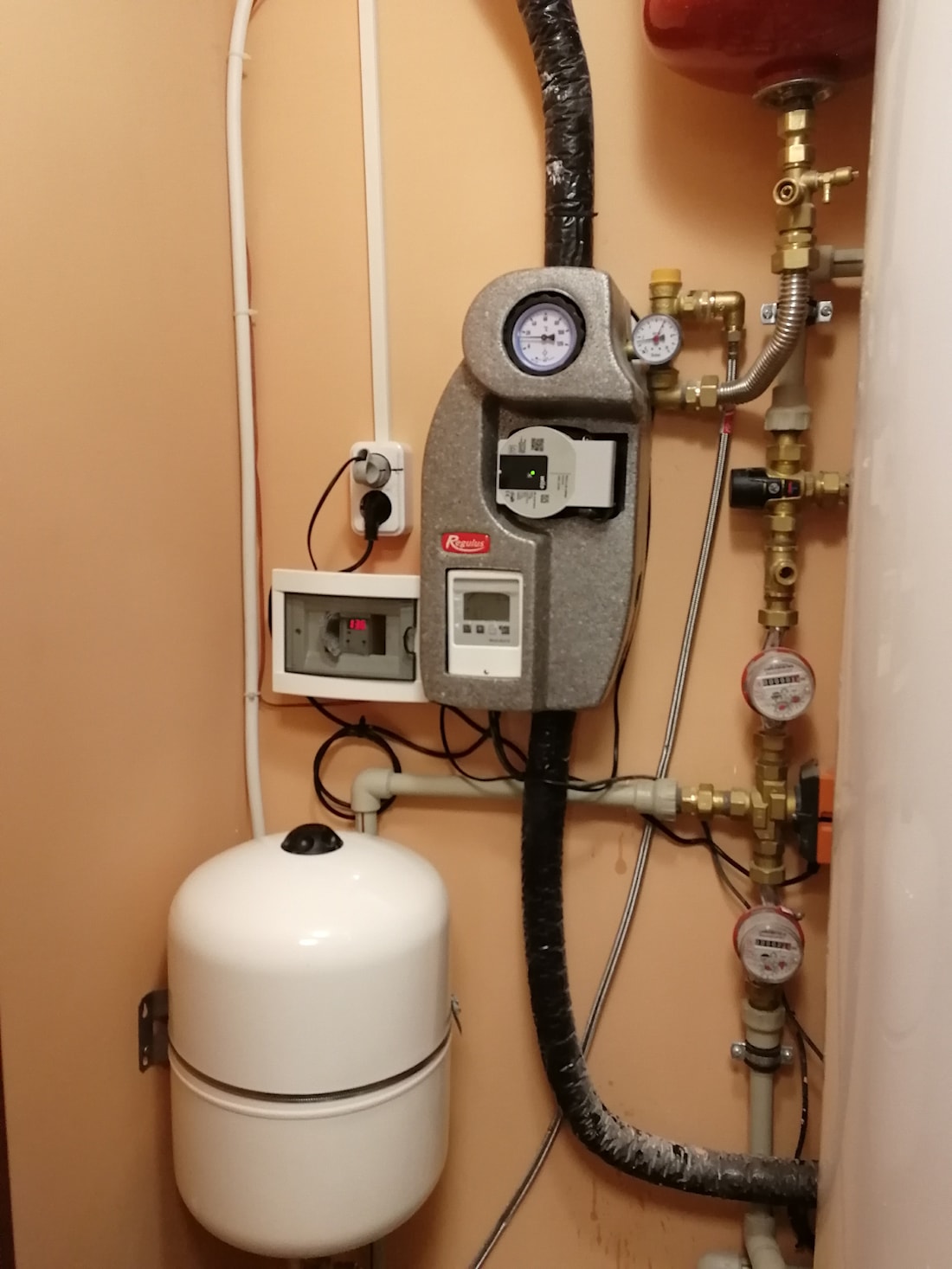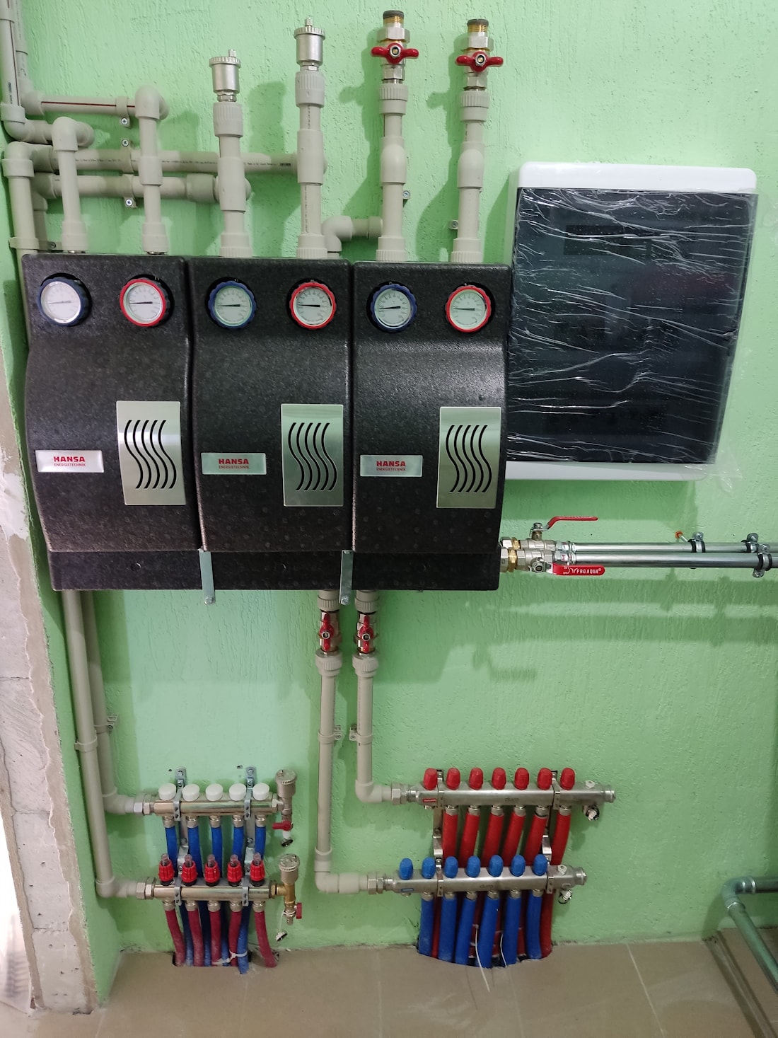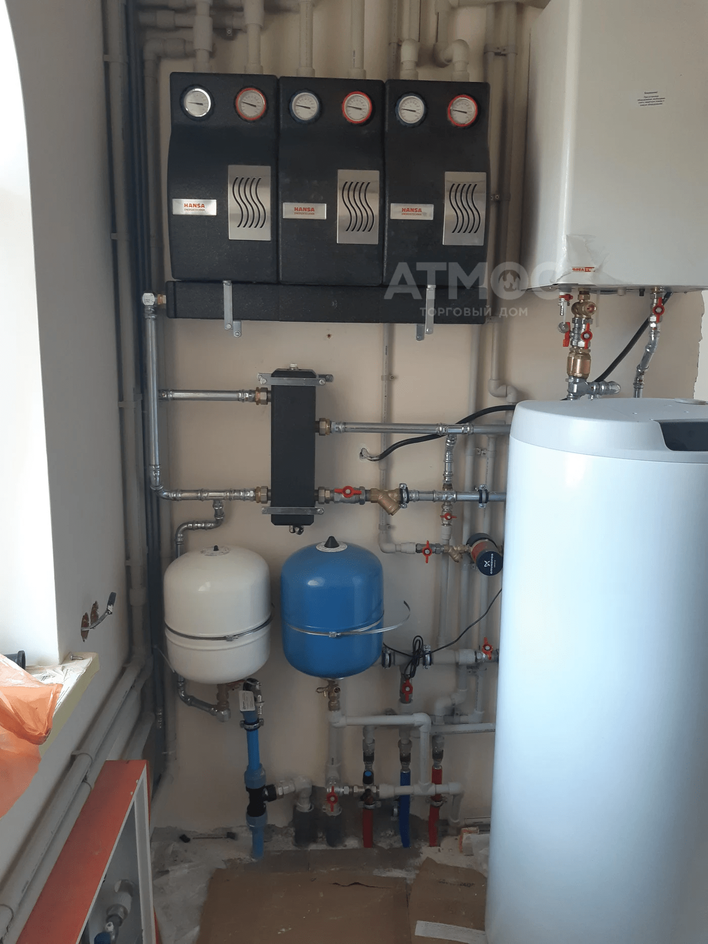 В системе отопления предусмотрено три контура: контур теплых полов, контур радиаторного отопления и контур ГВС. Для управления температурой в каждом из контуром установлены немецкие насосные группы HANSA. Данная схема предусматривает установку эквитермального управления системой отопления.