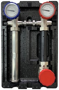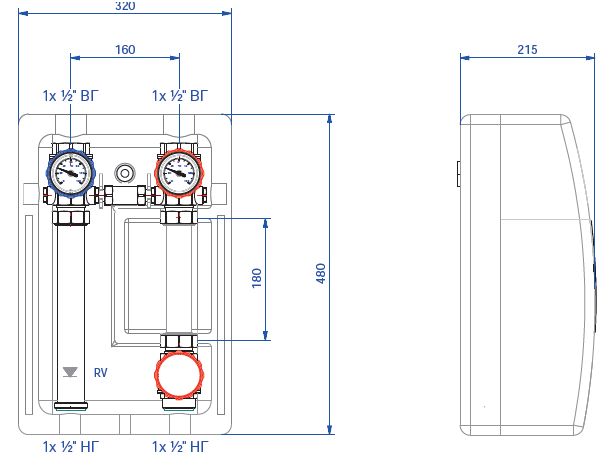- 2 шаровых крана DN25/32/40 со встроенными в рукоятку термометрами;