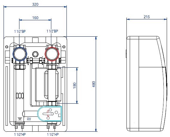 - 2 шаровых крана DN25/32/40 со встроенными в рукоятку термометрами;