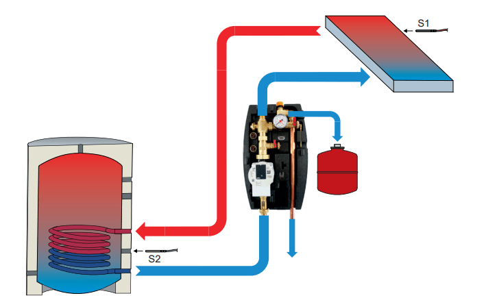 Считывание сигнала IPWM с насоса для измерения текущего расхода. Шаровые краны позволяют снимать регулятор с упорами и обеспечивают легкую замену уплотнительных колец с гайками без необходимости слива солнечной системы.