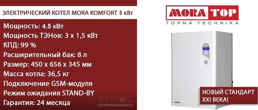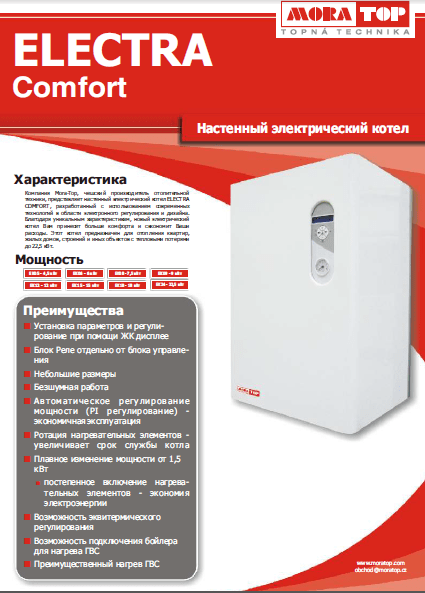 Преимущества электрического котла MORA-TOP ELECTRA Komfort 5 кВт Одноконтурный электрический котел MORA-TOP мощностью 5 кВт с функцией управления работой с помощью мобильного телефона предназначен для отопления частного дома или квартиры площадью 40-50 м2. Также отопительные электрические котлы MORA TOP ELECTRA Komfort 5 кВт можно использовать для подогрева ГВС, используя внешний накопительный водонагреватель косвенного нагрева.