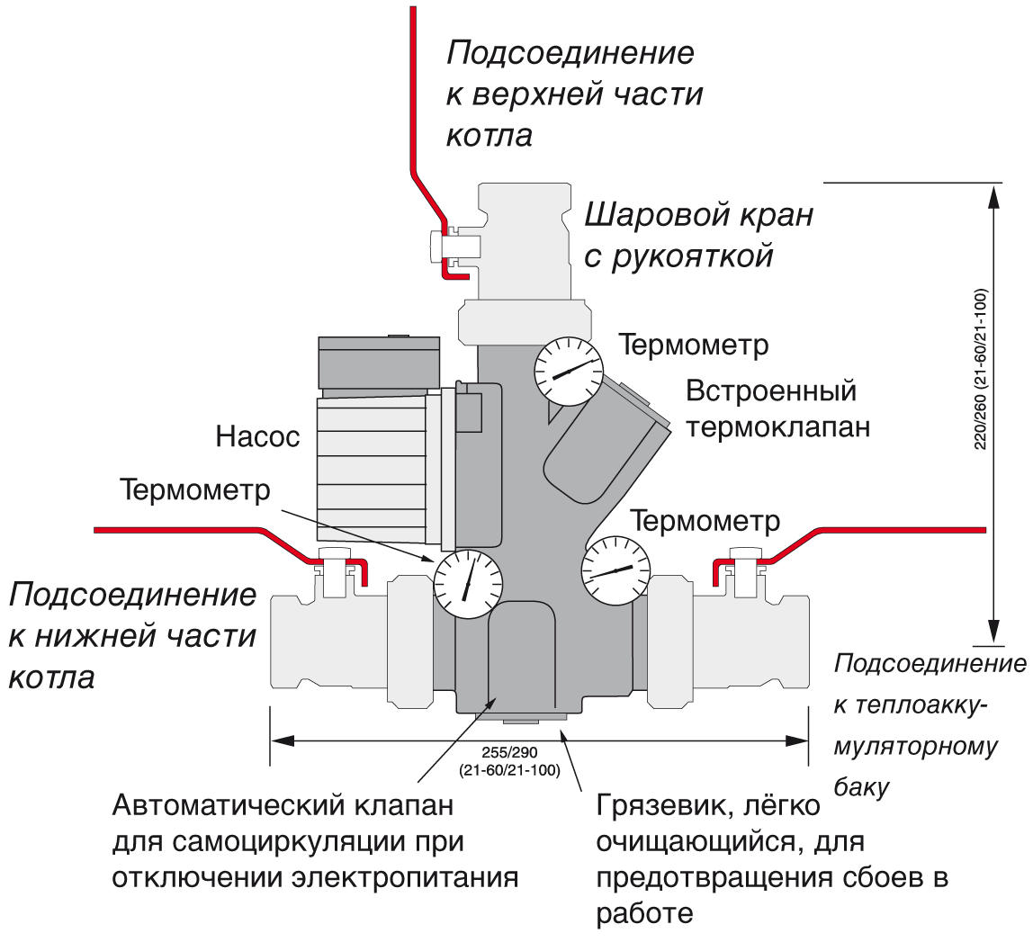 - Повышает температуру возвратной воды в котел, что предотвращает коррозию и образование смолы, продлевая таким образом срок службы котла.