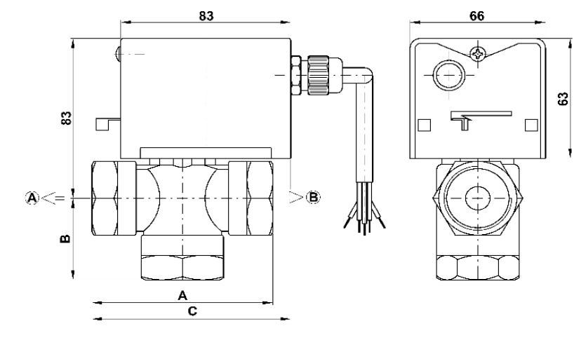 Клапан управляется возвратной пружиной - выход B открыт без напряжения, выход A открыт под напряжением.