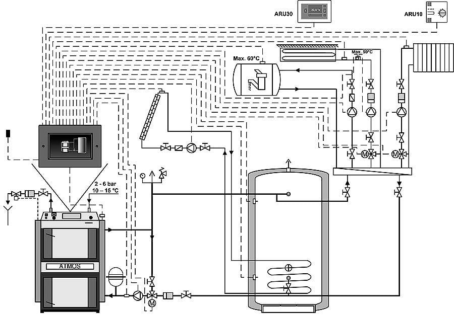 Схема подключения пиролизного котла ATMOS с автоматикой управления системой отопления ATMOS ACD 03: