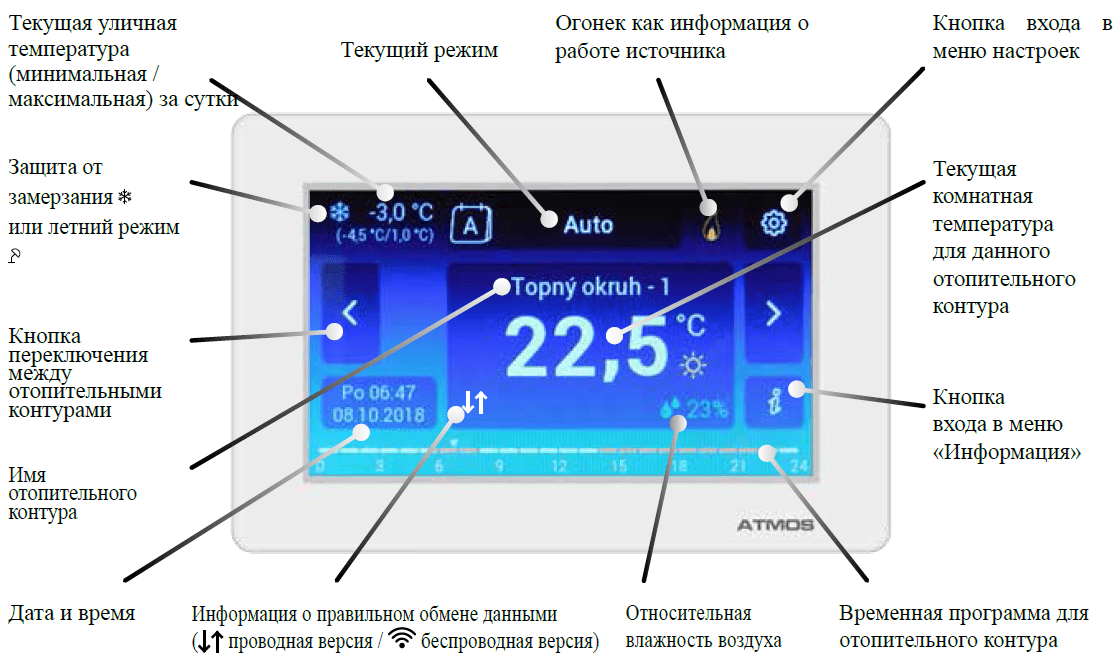 Эквитермический контроллер ATMOS ACD 03 с сенсорным дисплеем предназначен для комфортного управления системой отопления и горячего водоснабжения. Благодаря сенсорному дисплею управление контроллером является интуитивно простым.