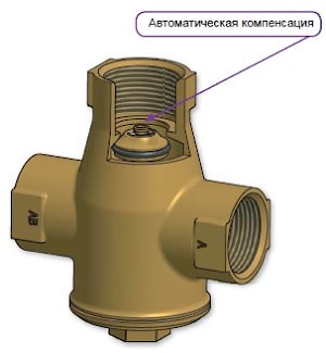 Трехходовой термостатический вентиль TSV5B для своей функции не требует применения компенсационного вентиля, имеет автоматическую компенсацию горячей воды, подаваемой по байпасу, установленному внутри клапана. Вследствие этого его установка более легкая, а регуляция более точная. Особенно в ситуации, когда температура возвратной воды из отопительной системы или аккумулирующего бака близка к номинальной температуре клапана или выше. В этом случае клапан автоматически ограничивает приток горячей воды из байпаса вплоть до его полного тесного запирания. Поэтому температрура твердотопливного котла не повышается и котел может при таких условиях работать на полную мощность.