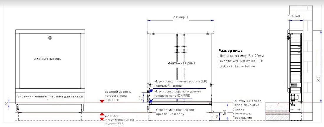 для труб для легкой установки распределительных труб. - Регулируемые по высоте ножки шкафа для конструкции пола (мин. 70 мм и макс. 190 мм).