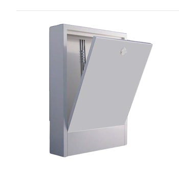 Изготовлен из оцинкованного стального листа с универсальной перфорацией сбоку для оптимального подключения коллектора. На задней стенке шкафа установлены две регулируемые монтажные шины для коллектора и съемная направляющая для легкой установки распределительных труб.