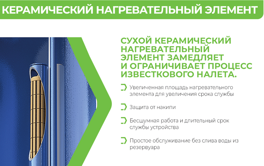 4. В бойлере комбинированного нагрева TESY ModEco Ceramic 150 установлен сухой керамический нагревательный элемент с двумя энергорежимами: 1,2 кВт и 2,4 кВт. Уникальная конструкция сухого ТЭНа обеспечивает надежную защиту от накипи, бесшумную работу и увеличенный срок эксплуатации ТЭНа.