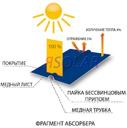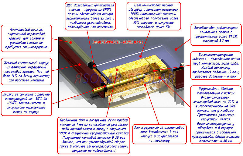 Главной особенностью солнечного коллектора ЯSolar является оптическое селективное покрытие, эффективная конструкция паяного медного абсорбера с покрытием TiNOX и уникальная теплоизоляция. Из-за низкого коэффициента черноты обратное излучение тепла в инфракрасном спектре минимально (3-5%). Получается "солнечная ловушка" с высокими показателями эффективности в условиях низких температур и малой солнечной инсоляции. Площадь контакта медного листа с трубкой коллектора в десятки раз больше чем у лазерной сварки. Это позволяет эффективно использовать солнечную энергию в системах нагрева воды и отопления, снижает тепловые потери коллектора и увеличивает его теплопроизводительность на 25-30%.